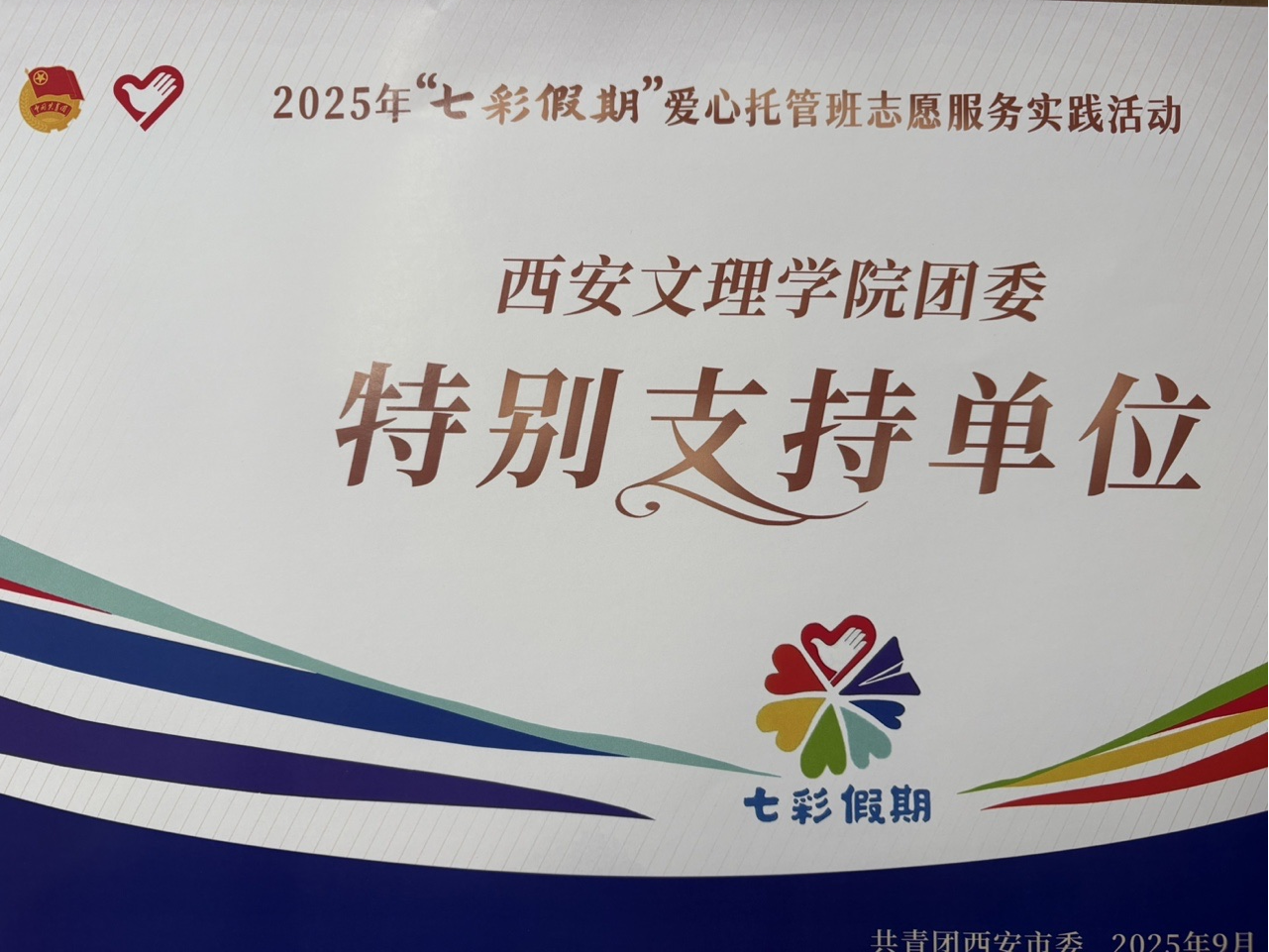 近日,共青团西安市委员会表彰了在2025年“七彩假期”志愿服务实践活动中表现突出的单位,我校团委荣获“特别支持单位”荣誉称号,得到共青团西安市委员会的高度评价与诚挚赞扬。