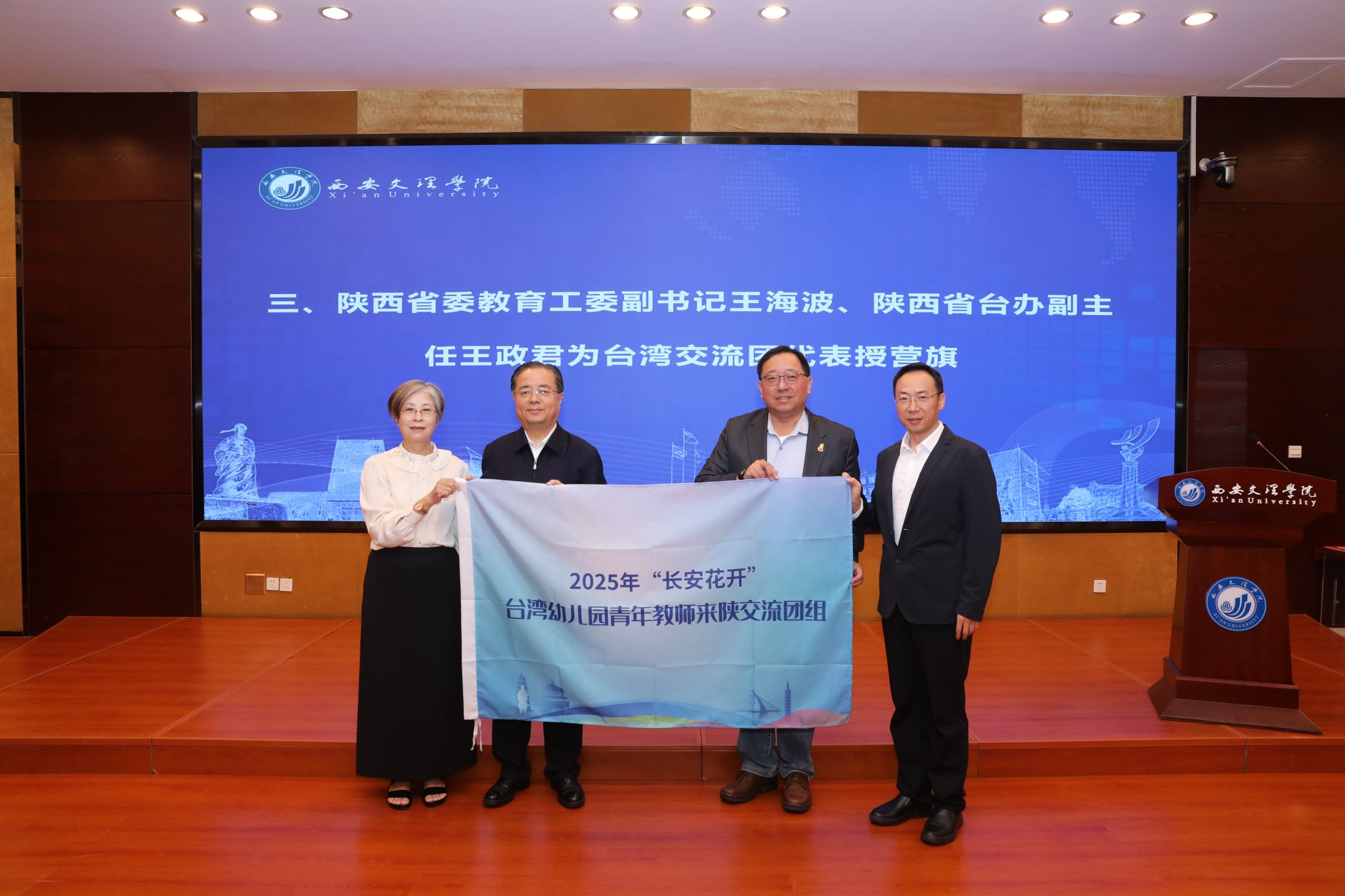 9月18日上午,2025年“长安花开”台湾幼儿园青年教师来陕交流活动开营仪式在我校举行。出席活动的领导及嘉宾有省委教育工委副书记、一级巡视员王海波,省人民政府台湾事务办公室副主任王政君;省教育厅港澳台办公室副主任张亮,省人民政府台湾事务办公室交流交往处三级调研员张洁;海峡两岸教育交流促进协会理事长路蕙鸿一行28名台湾幼儿园青年教师。我校校长陈刚、副校长刘明利,港澳台事务办公室主任俞华及学前教育学院的教师代表、学生代表参加了此次开营仪式。