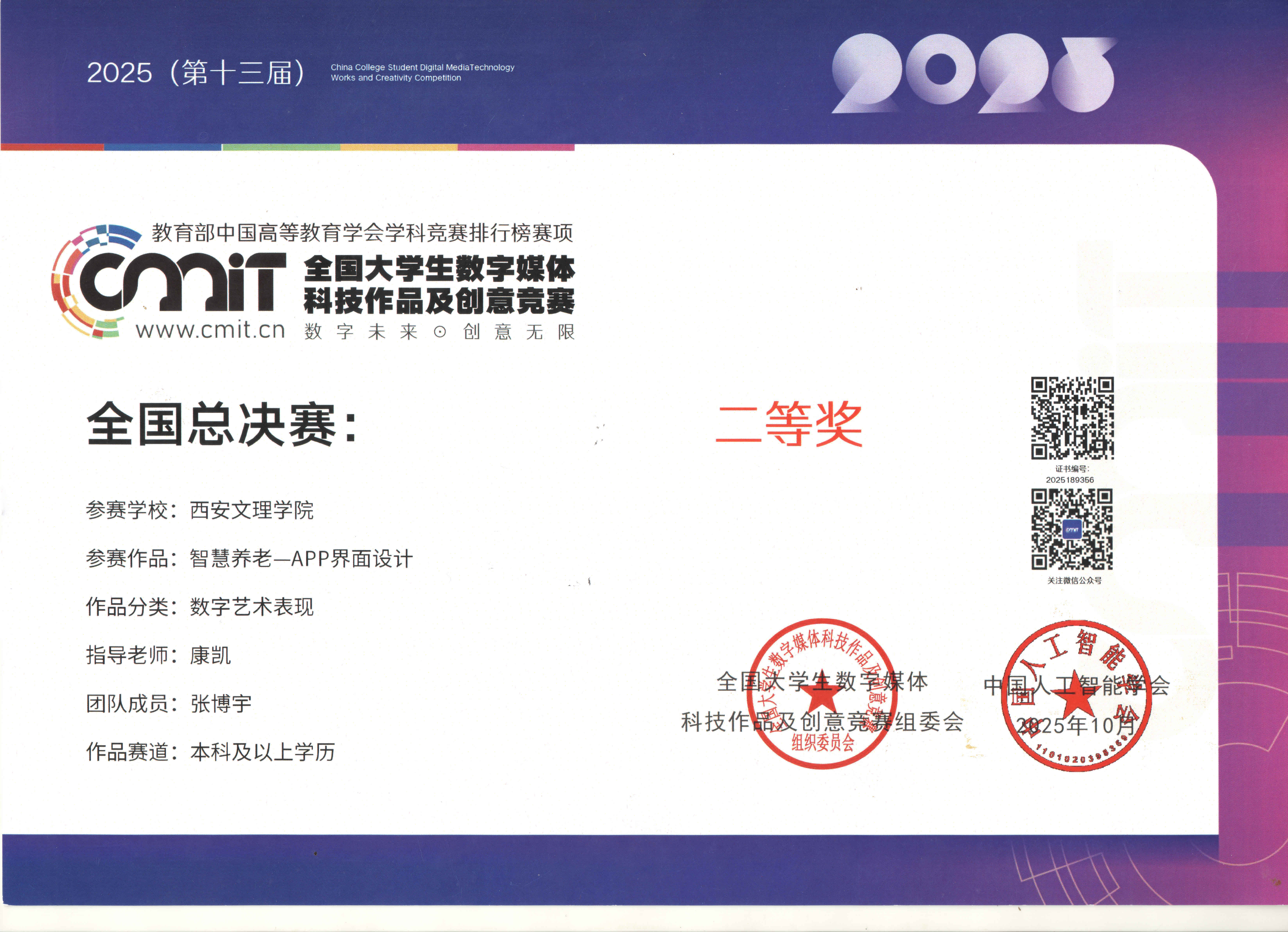 此次全国大学生数字媒体科技作品及创意竞赛是在全面贯彻落实党的二十大精神,推进“教育强国、科技强国、人才强国”战略背景下举办的全国性高水平学科竞赛,吸引了全国众多高校师生的积极参与。美术与设计学院获奖师生立足自身学科特色,将教师科研项目、教改与专业教学深度融合,通过创新实践教学将地域文化与专业知识深度融合:依托“走读秦岭”项目,以数字技术创新展现本土文化魅力;结合省级创新创业在线开放课程《产品开发设计》钻研陕西地域优秀传统文化元素,运用动态影像、AIGC等手法实现文化表达的当代转化;基于“AIGC与非遗传承”等研究方向,引导学生关注社会现实问题,运用数字艺术语言传递人文关怀。参赛作品既展现了我校学子扎实的专业能力,也体现了“以创促学、以美育人”的教学理念。